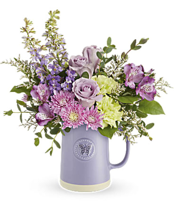 Indulge Mom's love for artisanal charm with our glazed ceramic pitcher, featuring a delicate embossed butterfly and a natural base, perfect for presenting fresh blooms that'll enchant her year-round.